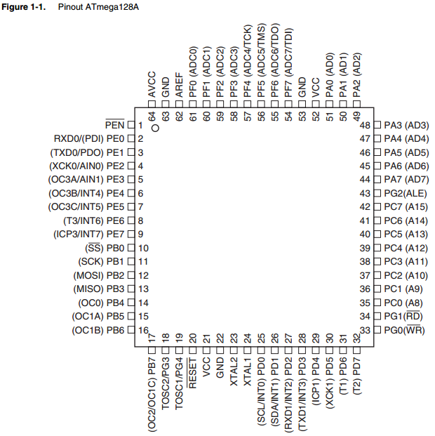 이번 동작을 구현하기 위해서 PD0 핀에 인터럽트를 연결하였다. 위의 Pinout에 대한 정보를 살펴보면 PD0 핀은 INT0 전용 핀인 것을 확인할 수 있다.