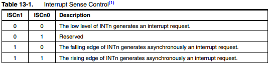 ISCxy비트는 외부 인터럽트를 발생시키는 조건으로 설정되는데, 주로 레벨 변화 혹은 엣지를 감지할 때 인터럽트를 발생시키는데에 사용된다.