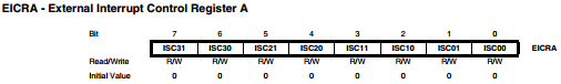 EICRA는 8bit 레지스터이며, 각 bit는 외부 인터럽트 핀 INT3:0에 해당된다. 이 레지스터의 비트는 ISCxy라 불리우며 각 핀에 대한 인터럽트 세트업을 결정한다.