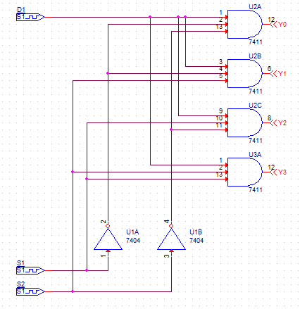디멀티플렉서는 4개의 출력 중에서 하나를 선택하여 입력 데이터를 내보내는 특징을 지닌다. 이를 위해 선택신호는 2개(S1, S2)를 필요로 한다.